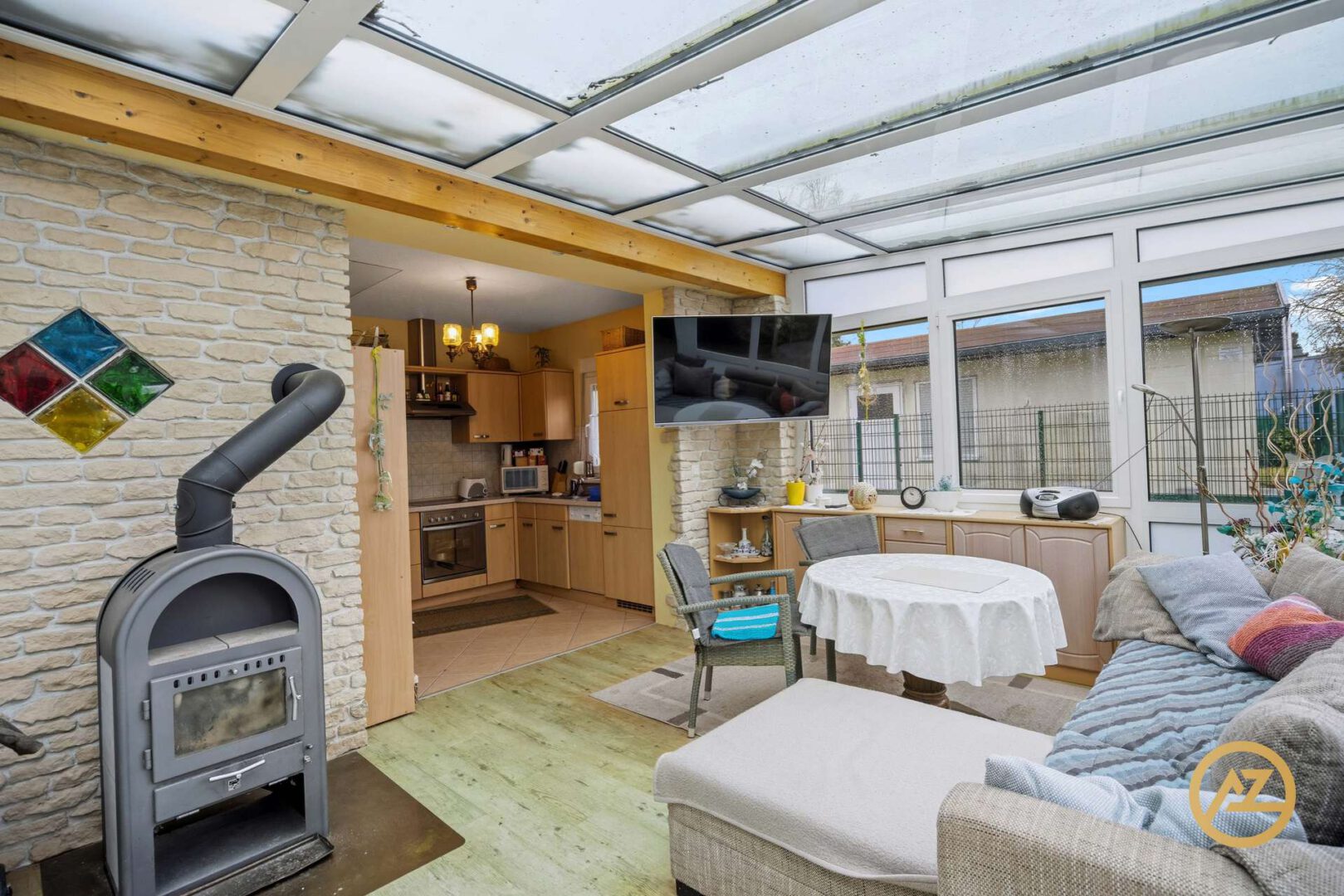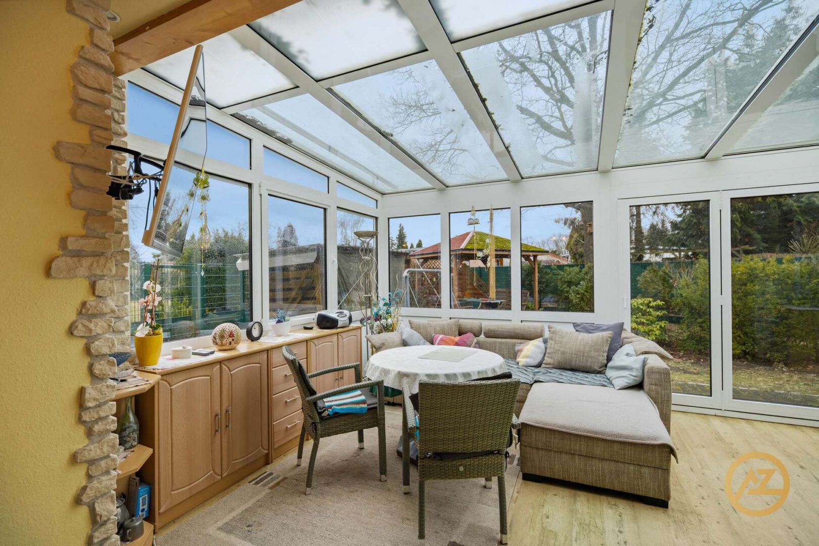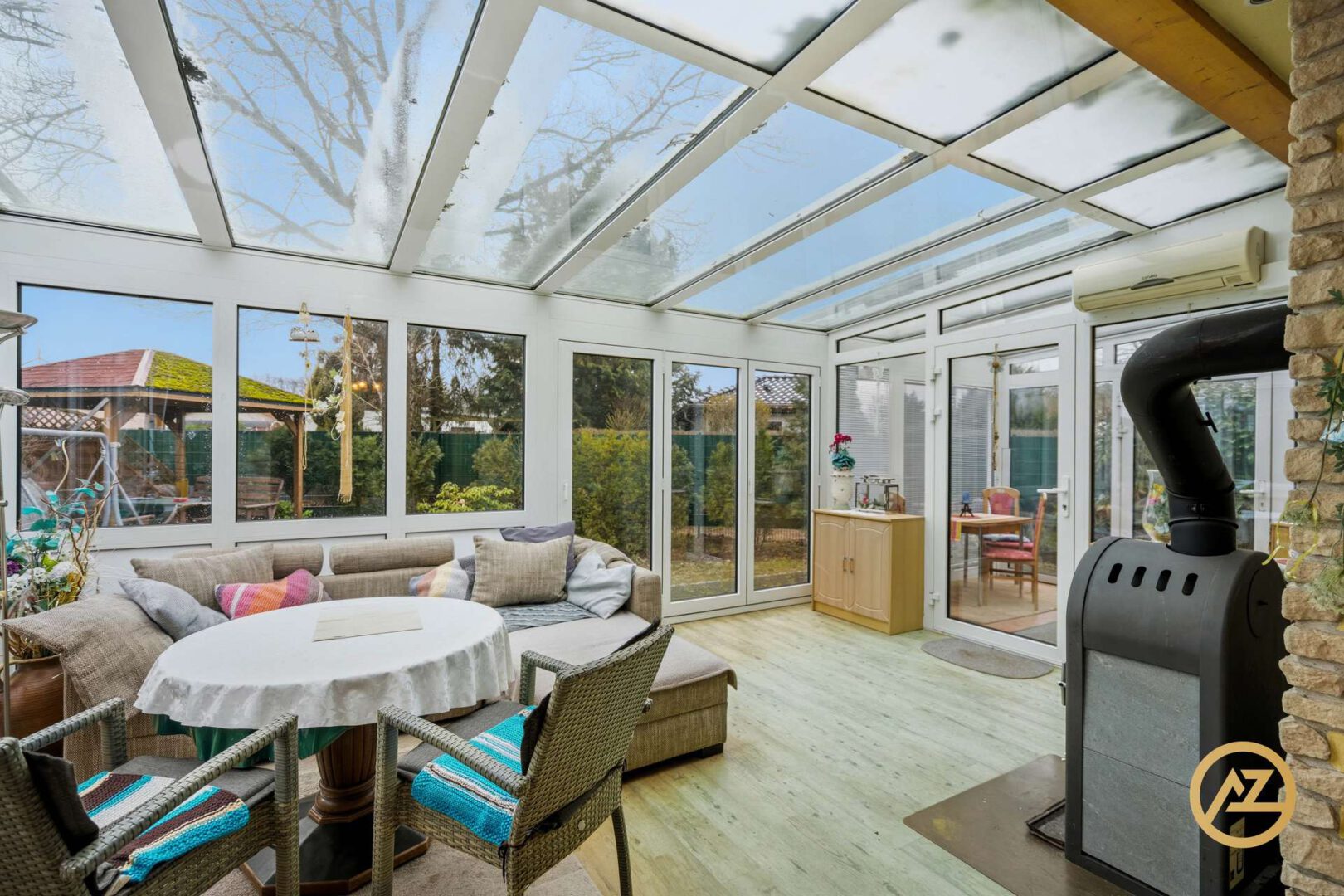 Besonderen Wohnkomfort bieten die durchgehend vorhandene Fußbodenheizung, eine Klimaanlage und das 70%tige Sonnenschutzglas für angenehme Temperaturen in den warmen Sommermonaten sowie ein Kamin, der in der kühleren Jahreszeit für eine behagliche Atmosphäre sorgt. Das Herzstück der Immobilie bildet der helle Wohnbereich im Wintergarten, der mit elektrischer und automatischer Verschattung ausgestattet ist und ein besonders angenehmes Wohngefühl vermittelt.