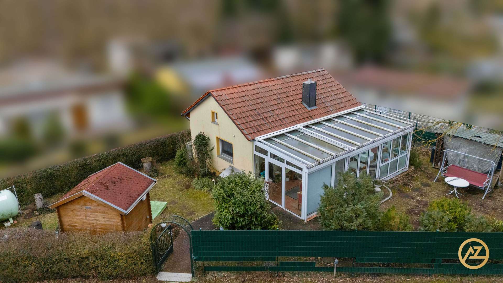 Ergänzt wird das Raumangebot durch ein Schlafzimmer, eine Küche mit Einbauküche, einen kleinen Vorraum sowie ein Tageslichtbad mit Badewanne und Dusche. Im Außenbereich laden eine kleine überdachte Sitzecke sowie die naturnahe Lage zu entspannten Stunden im Freien ein. Zur Immobilie gehören außerdem ein Garagenstellplatz sowie ein Abstellschuppen mit voll unterkellerter Stahlbetonunterkellerung und zusätzlicher Nutzfläche.