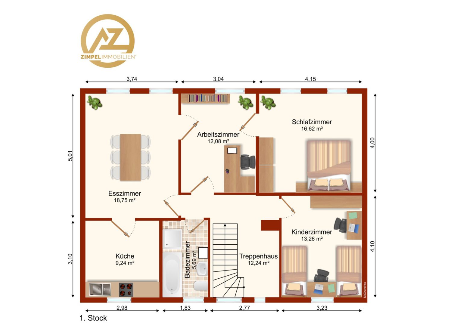 Das Erdgeschoss verfügt über ein geräumiges Wohnzimmer, eine Küche sowie zwei weitere Räume, die als Esszimmer, Arbeitszimmer oder Schlafzimmer genutzt werden können. Im Obergeschoss stehen drei Zimmer, eine zweite Küche und ein Badezimmer zur Verfügung. Damit besteht die Möglichkeit, das Haus als Zwei-Parteien-Haus zu nutzen oder eine Etage als separate Wohneinheit einzurichten. Besonders reizvoll ist das Dachgeschoss, das mit rund 75 m² zum Ausbau einlädt und weiteren Wohnraum schaffen kann.