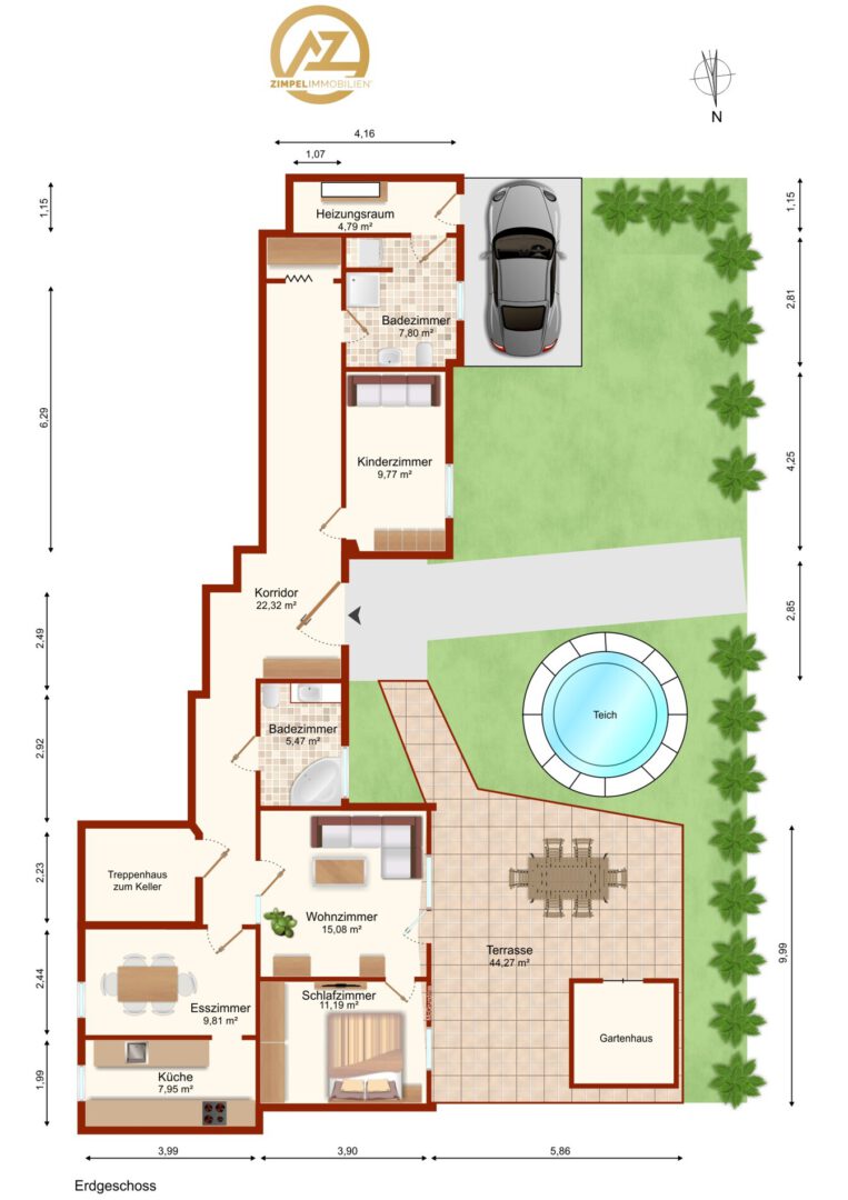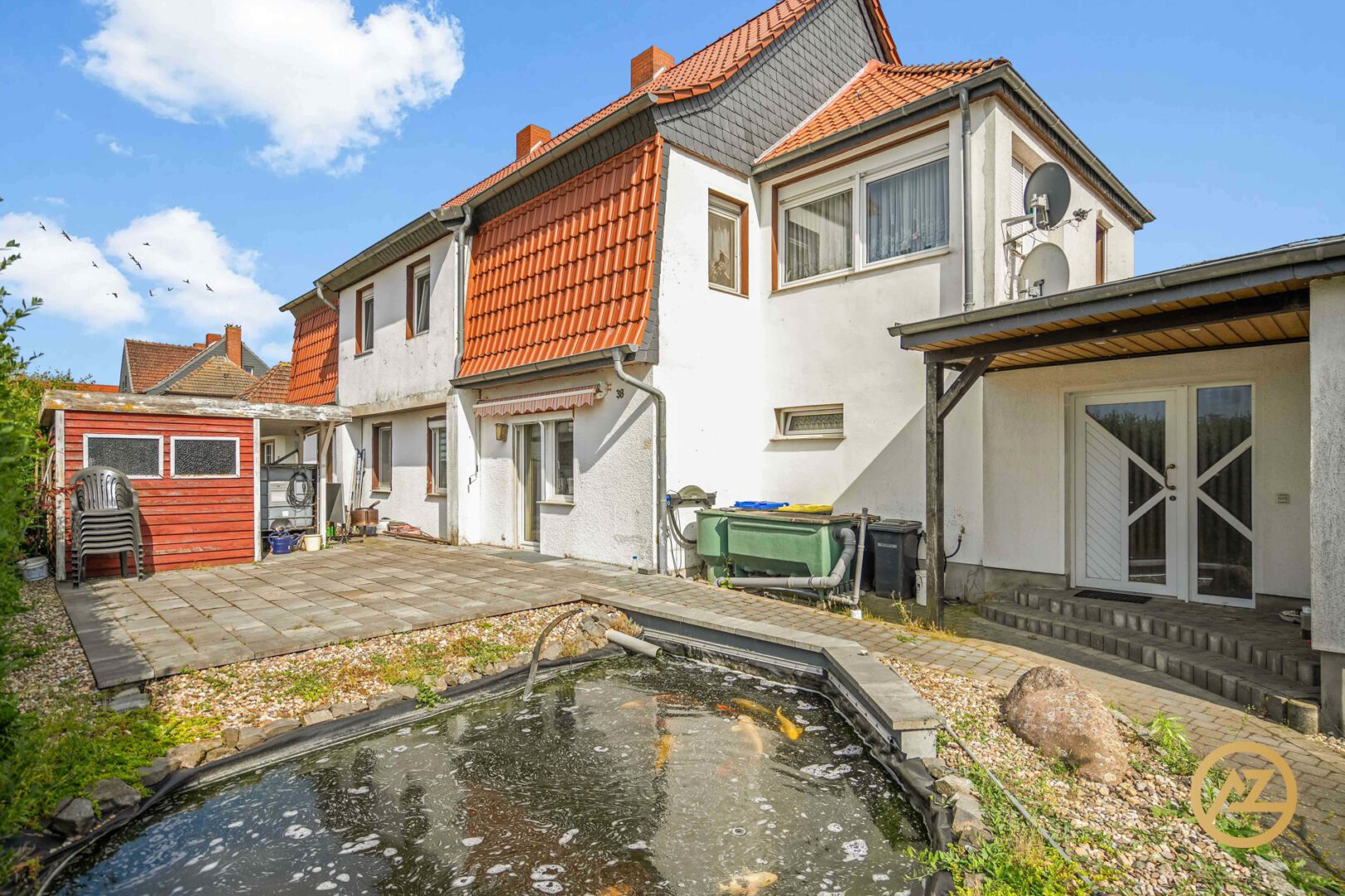 Im Erdgeschoss befinden sich eine voll ausgestattete Einbauküche, ein angrenzendes, lichtdurchflutetes Esszimmer und ein gemütliches Wohnzimmer mit direktem Zugang zur beeindruckend großen Terrasse. Diese lädt mit viel Platz und einem eigenen Gartenhaus zu entspannten Stunden im Grünen ein. Der anschließende Garten rundet das Hausgefühl perfekt ab.