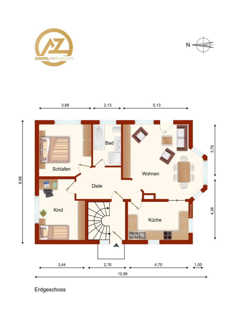 Im Erdgeschoss erwartet Sie ein wohnlicher Grundriss mit einem geräumigen Wohnzimmer samt Kamin und direktem Zugang zur Terrasse und in den Garten. Ergänzt wird diese Ebene durch zwei Schlafzimmer, eine Küche und ein Badezimmer.